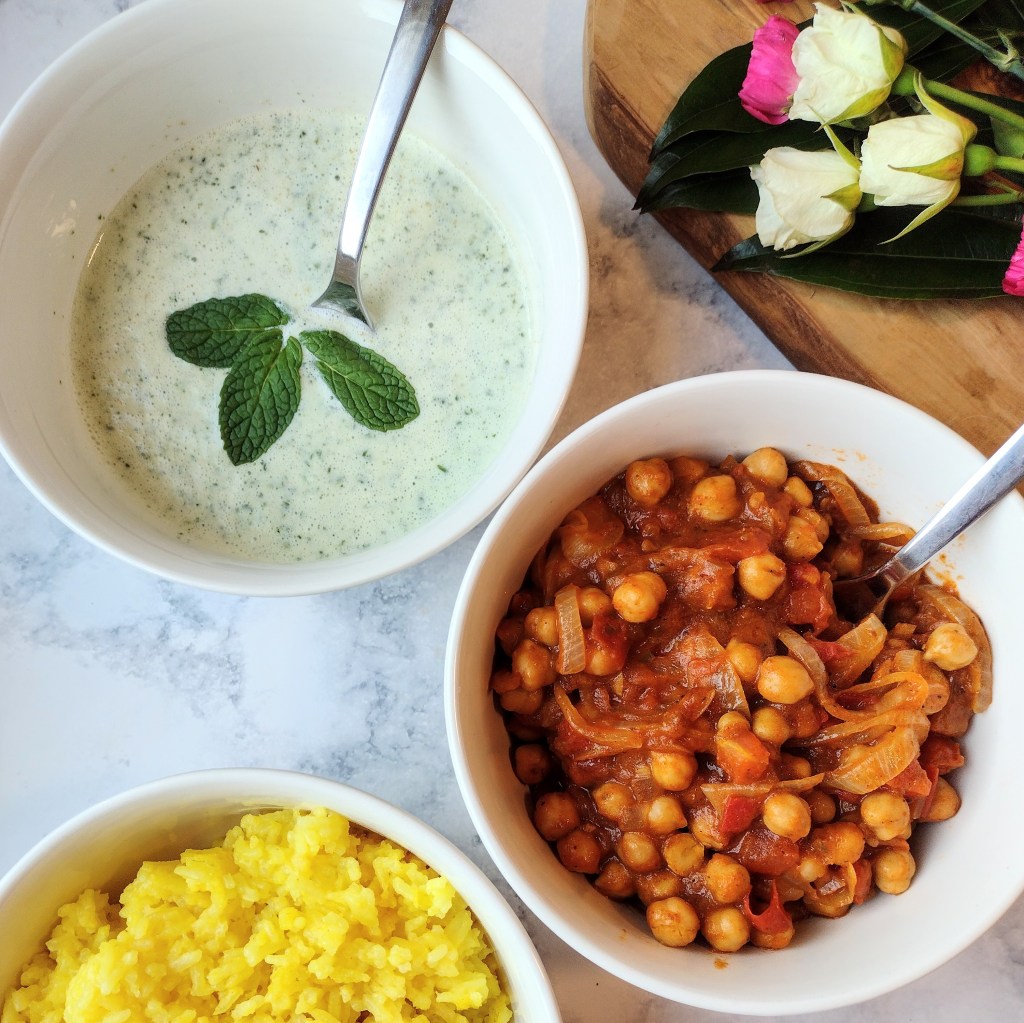 Wow, already Wednesday! I made a super quick and yummy dinner using leftover lemon rice and an Indian sauce that I’ve never tried before called Spicy Vindalo (by Maya Kaimal). I sauteed 2 roma tomatoes and 1/2 a yellow onion to add to the sauce (next time I’ll blend it after cooking). Then I just threw the ingredients for mint raita in my blender. Yum is all I can say! I love making a big pot of rice for the week because everything else comes together nicely when you don’t feel like cooking.